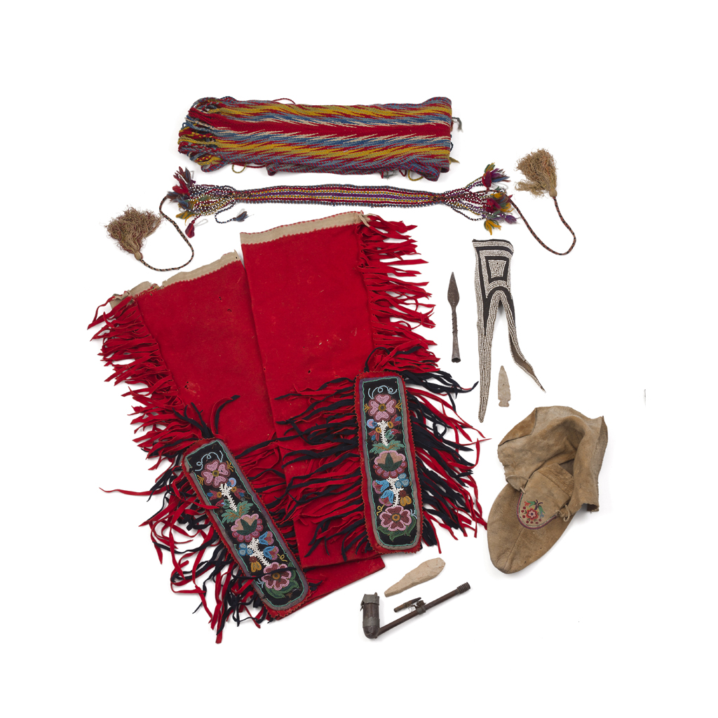 with beadwork panels decorated with flower heads and tendrils with crimson and black fringe; together with a HEADBAND with eight rows of cotton interlaced with white beads, rosettes and tassels; a SMALL FLINT AXE HEAD AND ARROWHEAD; a PEACE PIPE; an IRON FISHING SPEARHEAD; a BUCKSKIN MOCCASIN; a WOVEN WAISTBAND; and a SOUTH AFRICAN BEADWORK FEMALE 'FULL DRESS' with old label dated 1850 (10)