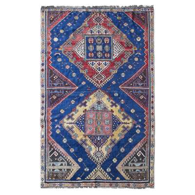 possibly Karabagh, the indigo field with two yellow and red lozenge medallions, within narrow ivory S lozenge border