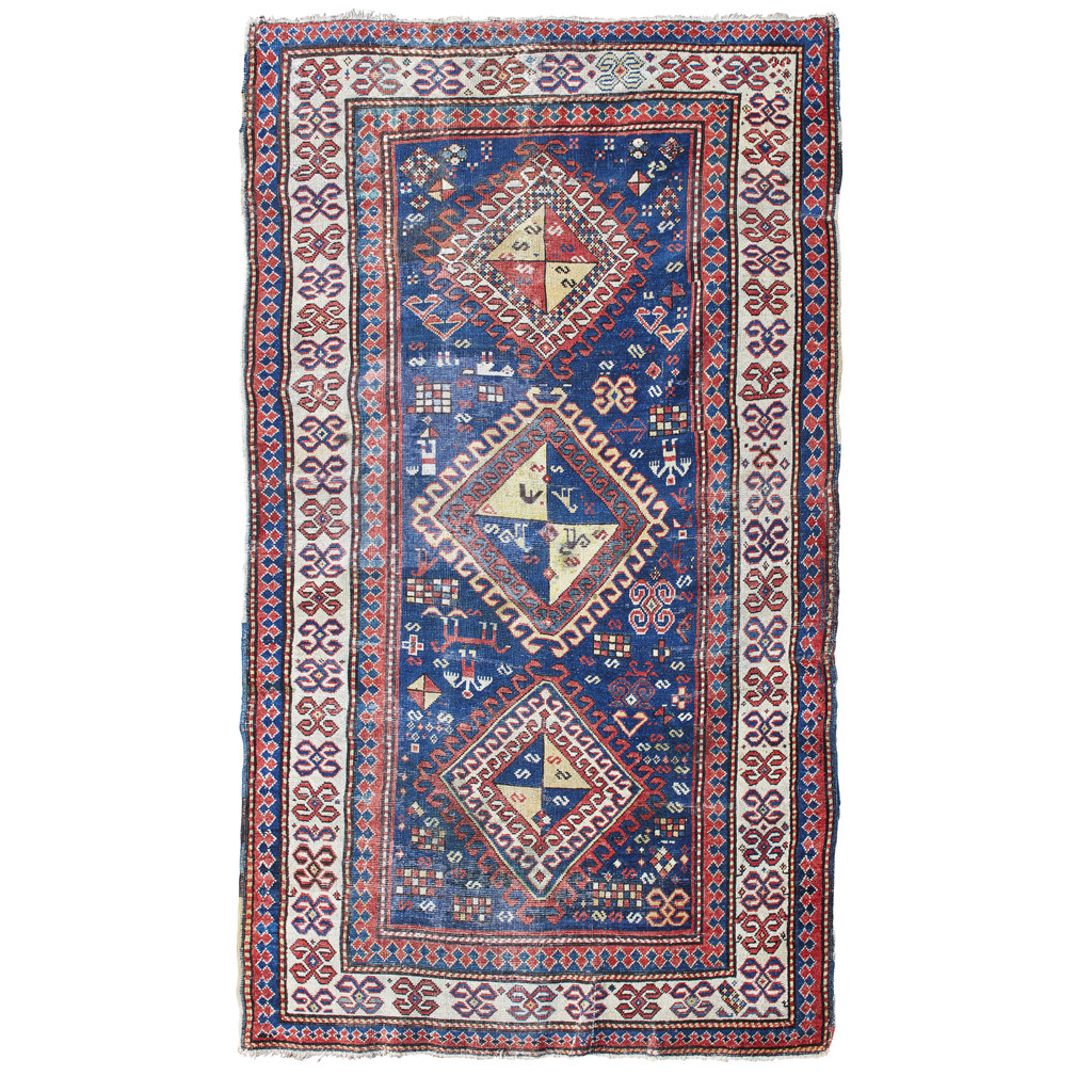 of Kazak style, the indigo field with three polychrome hooked lozenge medallions, within ivory hooked motif border