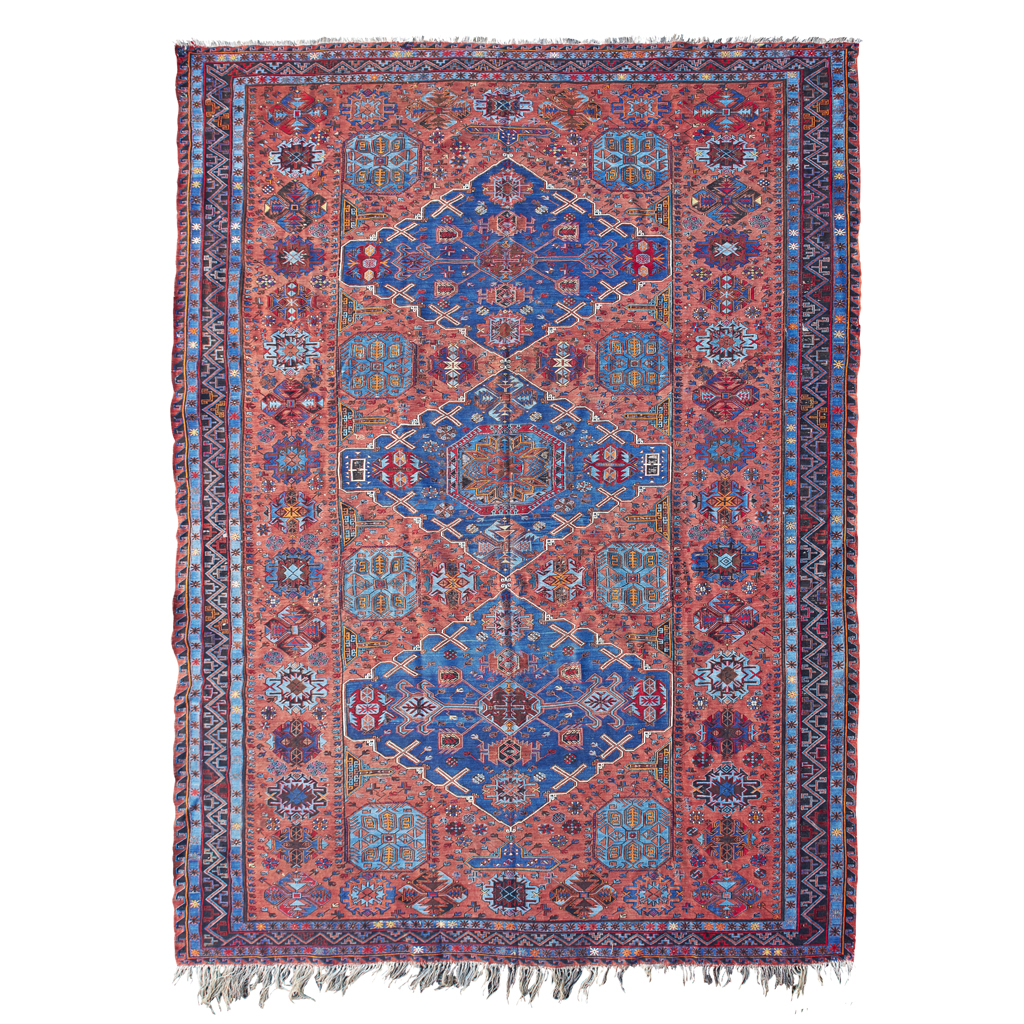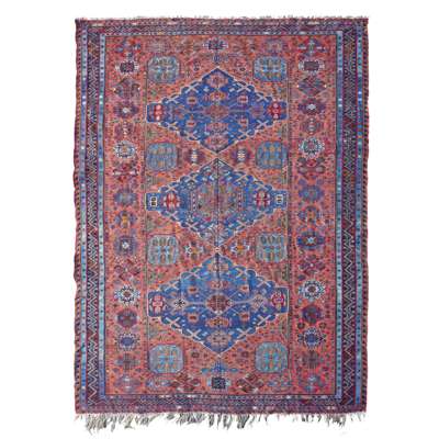 the rust brown field with three indigo lozenge medallions, within dark brown zigzag border