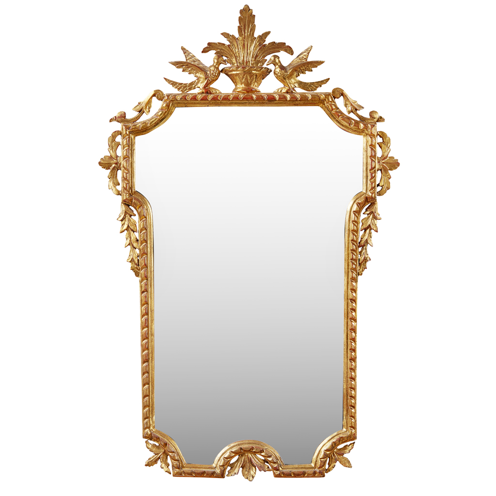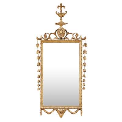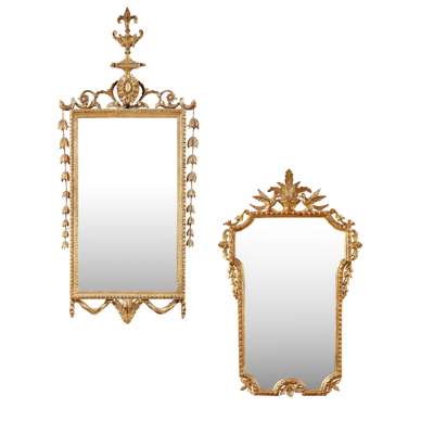 the shaped rectangular mirror plate in a giltwood frame with bird and foliate cresting and trailing laurel garlands, 85cm high, 54cm wide; the second with a rectangular mirror plate in a giltwood frame with a sunflower and urn cresting and bellflower trails, 117cm high, 51cm wide (2)