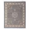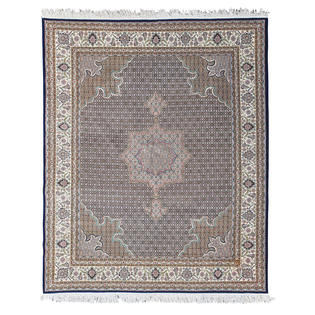 the indigo field with cream medallion, olive and grey spandrels, allover small herati pattern, within cream turtle plamette and vine border