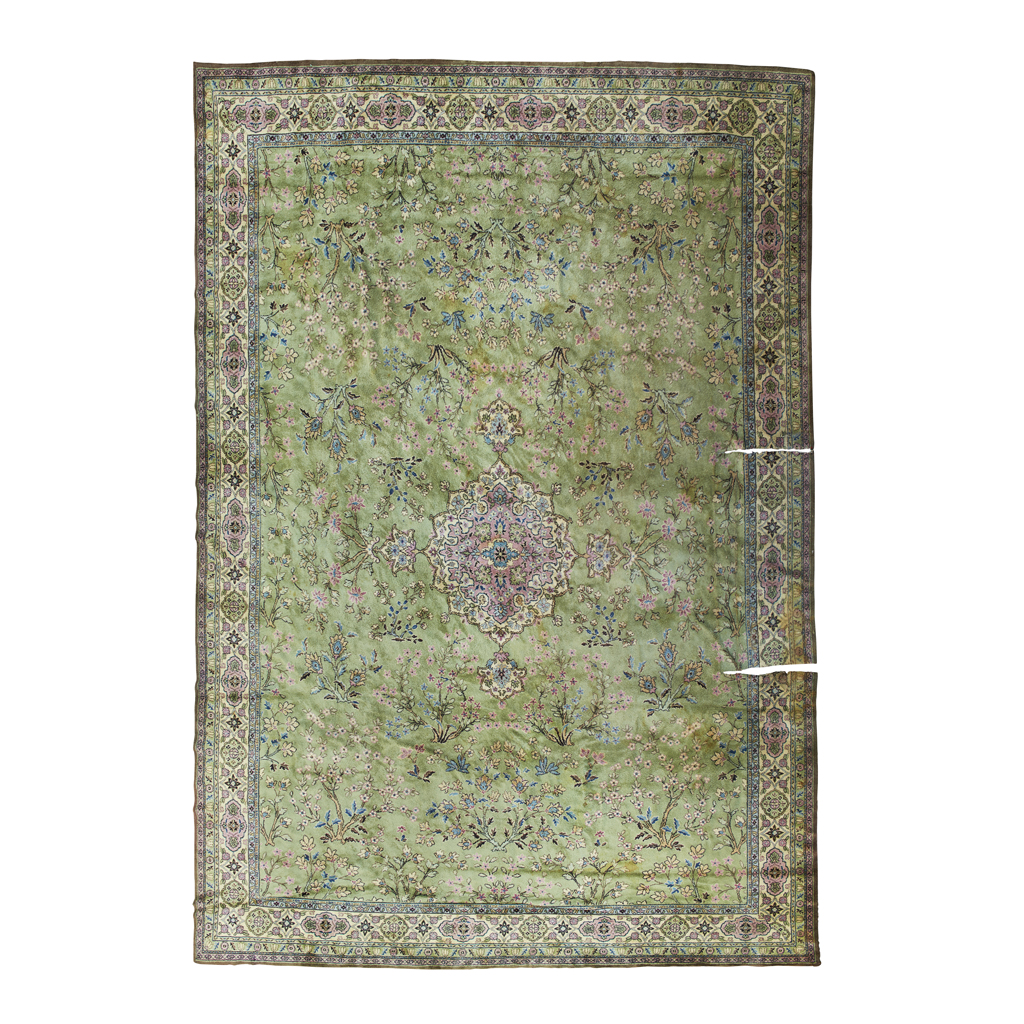 of Persian style, the olive green field with mauve medallion, within lemon border