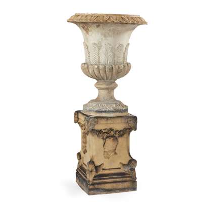 of campana form with leaf tip moulded rim and body, on a socle and leaf cast circular base; the square pedestal with moulded rams' masks and putti at the corners, the sides with relief profile portraits of Robert Burns and Sir Walter Scott with floral garlands, on a plinth base