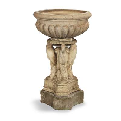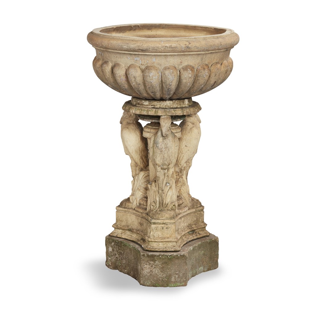 the low wide lobed top on moulded column support with herons standing in bullrushes, on a triform plinth base