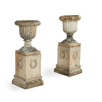 the lotus shaped urn on fluted socles and square plinth bases, one impressed CRAIG / PERCETON / KILMARNOCK ; the square pedestals with laurel wreaths on the sides (2)