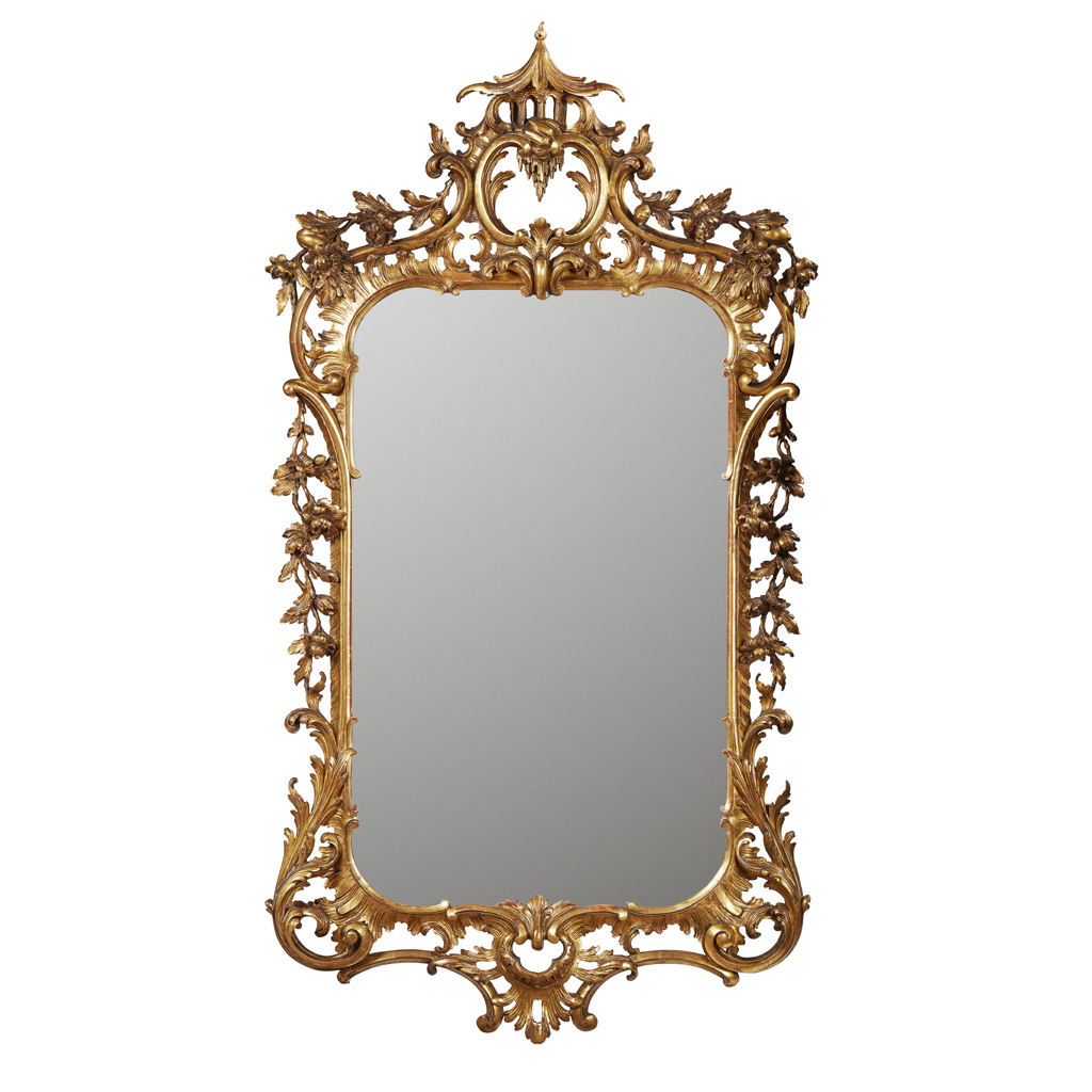 the shaped rectangular mirror plate in a pierced rococo style frame with C-scrolls, flower garlands and surmounted by a pagoda cresting