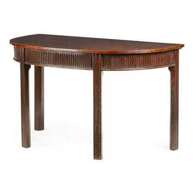 the D-shaped tops over a deep fluted frieze, raised on moulded straight chamfered legs, previously the ends of a dining table (2)