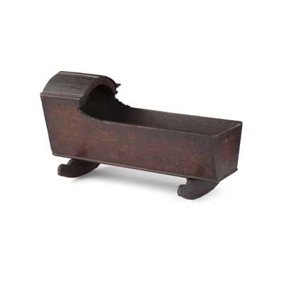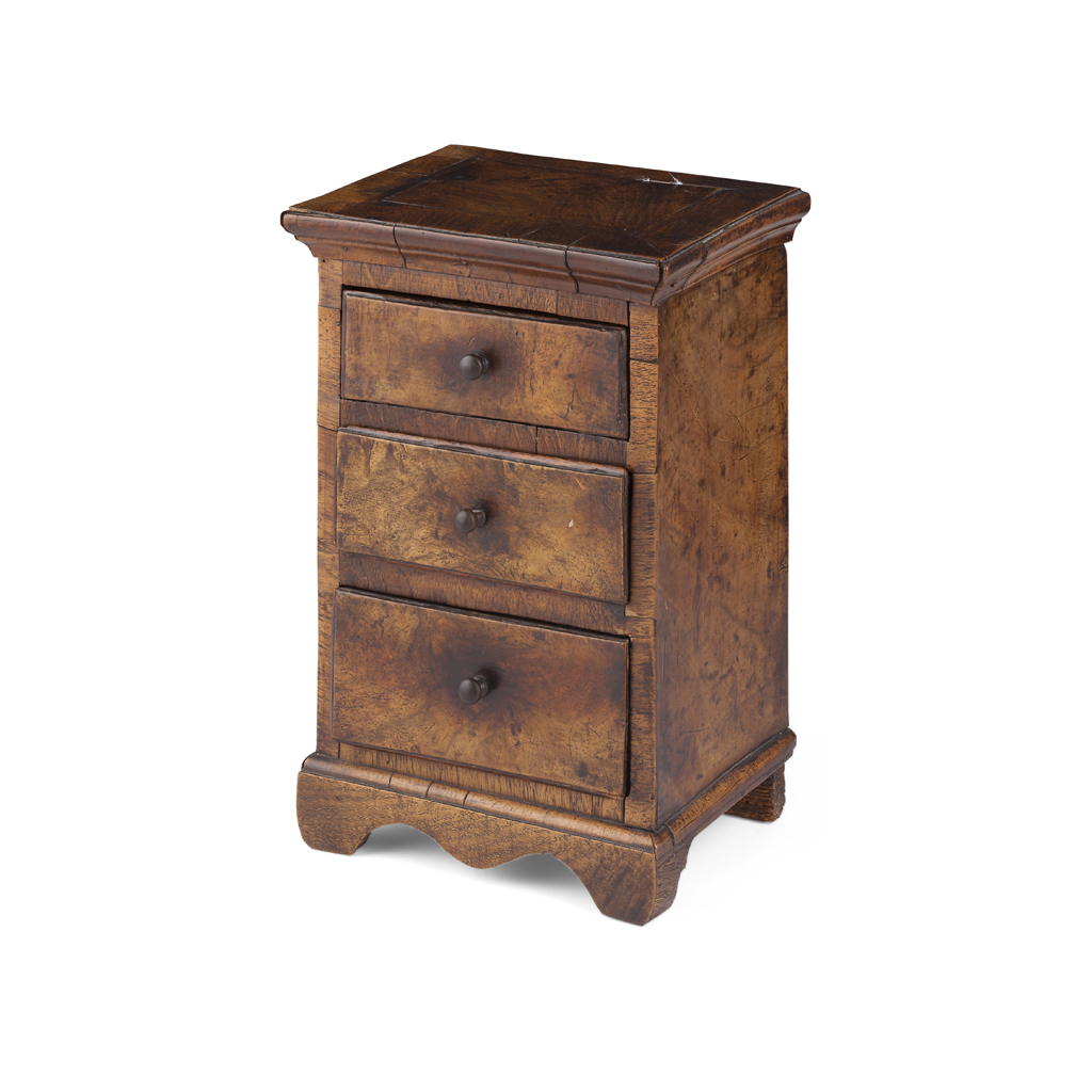 with three drawers above a shaped apron, 26.5cm high; together with a MINIATURE OAK CRIB, with a carved domed hood, raised on rockers, 41cm long (2)
