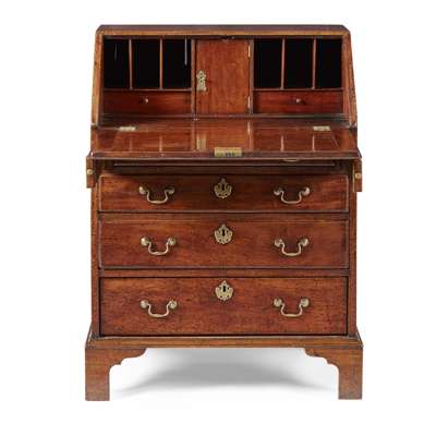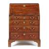 the slant front enclosing a fitted interior, over four long drawers and raised on shaped bracket feet
