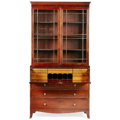 the moulded cornice above a pair of astragal glazed doors opening to adjustable shelves; the lower part with a secretaire drawer fitted with drawers and pigeon holes, above three long graduated drawers, raised on splay feet