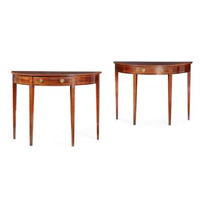 PAIR OF GEORGE III STYLE MAHOGANY AND KINGWOOD DEMI LUNE SIDE TABLES
