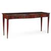 the serpentine top with line and chequer banding, above a deep plain frieze, raised on square tapered legs