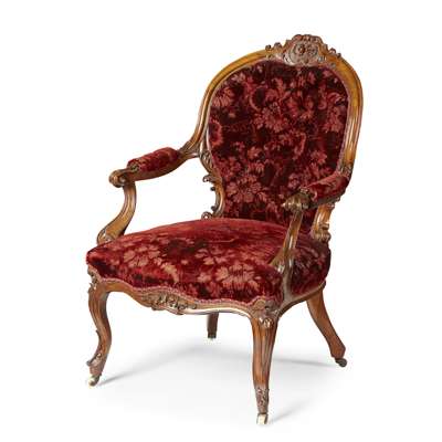 the curved balloon back above a stuffover seat and part padded open arms with scroll terminals, raised on flower and leaf carved cabriole legs ending in porcelain castors, in red velvet upholstery