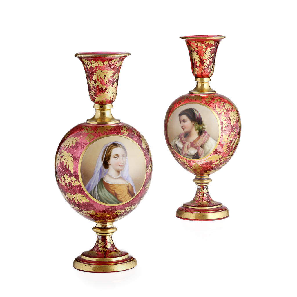 PAIR OF BOHEMIAN ENAMELLED CRANBERRY GLASS VASES