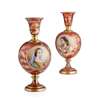 with everted necks tapering to ovoid bodies and raised on circular socle feet, with enamelled roundels of ladies, on a gilt floral and leafy ground (2)