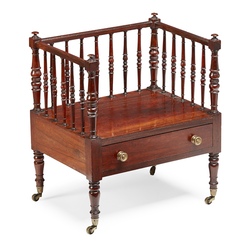with three quarter spindle gallery above a single base drawer, raised on turned legs with brass caps and castors