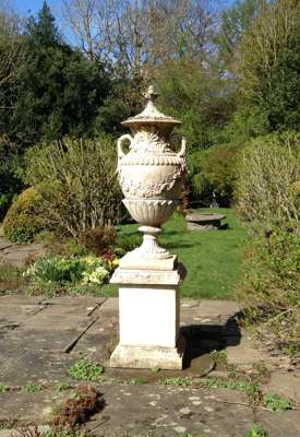 LARGE COMPOSITION AND CAST STONE COVERED URN AND STAND
