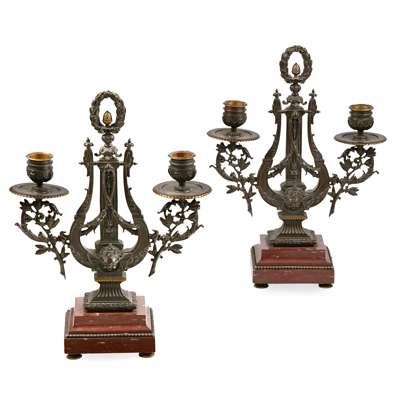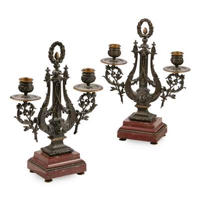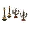 the first with urn form holders above fruiting collars and tapered reeded columns, terminating on triform bases with lion's paws feet, 31cm high; the other as candelabra with pinecone finials above lyre form columns with putto masks and issuing twin outscrolling arms, on rouge marble bases, 31cm high (4)