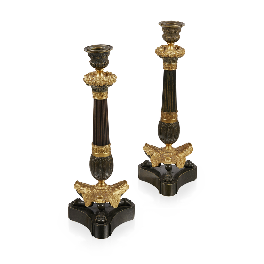 TWO PAIRS OF REGENCY GILT AND PATINATED BRONZE CANDLESTICKS
