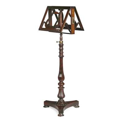 the ratchet adjustable twin music stands on a rising facetted baluster column and triform base with pad feet