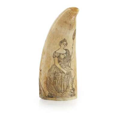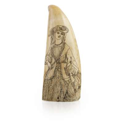 Note: Scrimshaw artists of the 19th century regularly used both patriotic figures and images published in the popular press as sources for their work. It is thought that this depiction of Liberty was taken from the newspaper 'Gleason’s Weekly Line-of-Battle Ship', which featured this image of the goddess alongside Justice. The portrayal of the lady to the other side was taken from Harper's New Monthly Magazine; a common source used by whalemen during the 19th century. Literary and political figures, as well as fashion-plates, were also regularly depicted on whale's teeth.