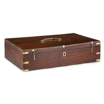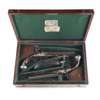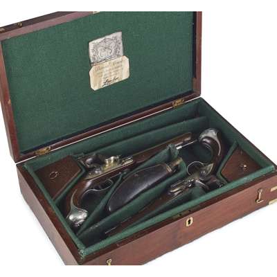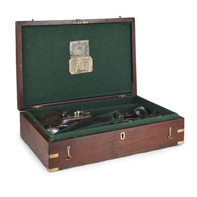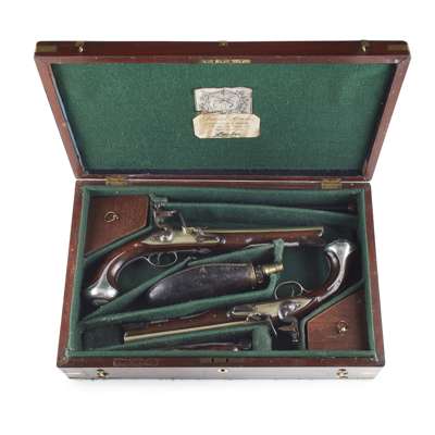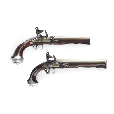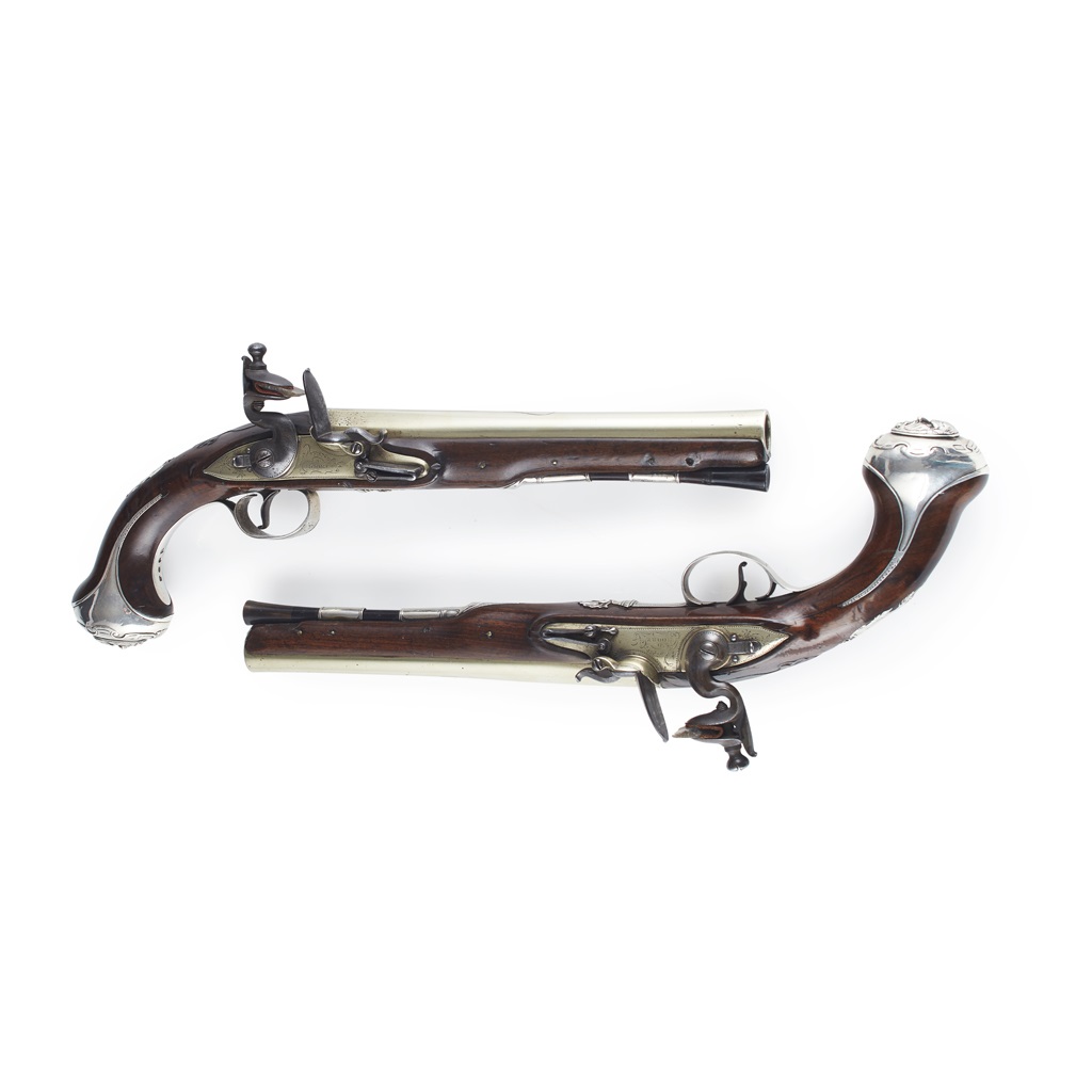 each with brass locks and barrels signed MOORE, LONDON, struck with London gunmaker's view and proof marks, and with DM makers mark at breech, with silver furniture in the rococo style and shell-form trigger guard finials, hallmarked London, 1774 with marks for John King, with polished walnut full stocks with spurred silver butt caps and grotesque mask finials, the silver ramrod pipes and side plates holding horn tipped ramrods, in a later fitted brass bound mahogany case, with a black leather powder flask stamped with initials on the brass mount, and further accessories (2)