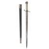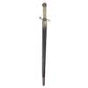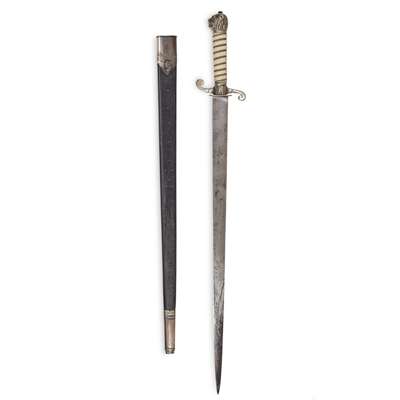with a cast silver lion's head pommel and bone hilt bound with a triple twist of wire, above the recurved quillion struck with a rubbed hallmark, flanking an engraved quillion block, with a flat section single edge tapering blade, double edged six inches from the tip, in black leather scabbard with white metal locket and chape