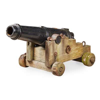 of 6 pounder type cast with the Royal Crown with a ringed chasuble for the retaining rope , on a wooden sea service carriage