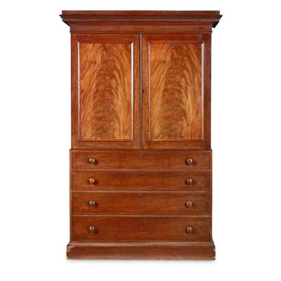 the moulded cornice above a pair of panel doors opening to sliding trays and a pair of short drawers' the lower part with four graduated drawers, on a plinth base