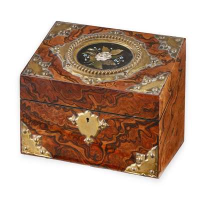 the hinged slant top mounted with a Derbyshire marble reserve depicting flowers, opening to a void interior with a silk-lined lid and retailer's label J & T. FORGIE/ 93 BUCHANAN ST./ GLASGOW, with a further paper label to the underside