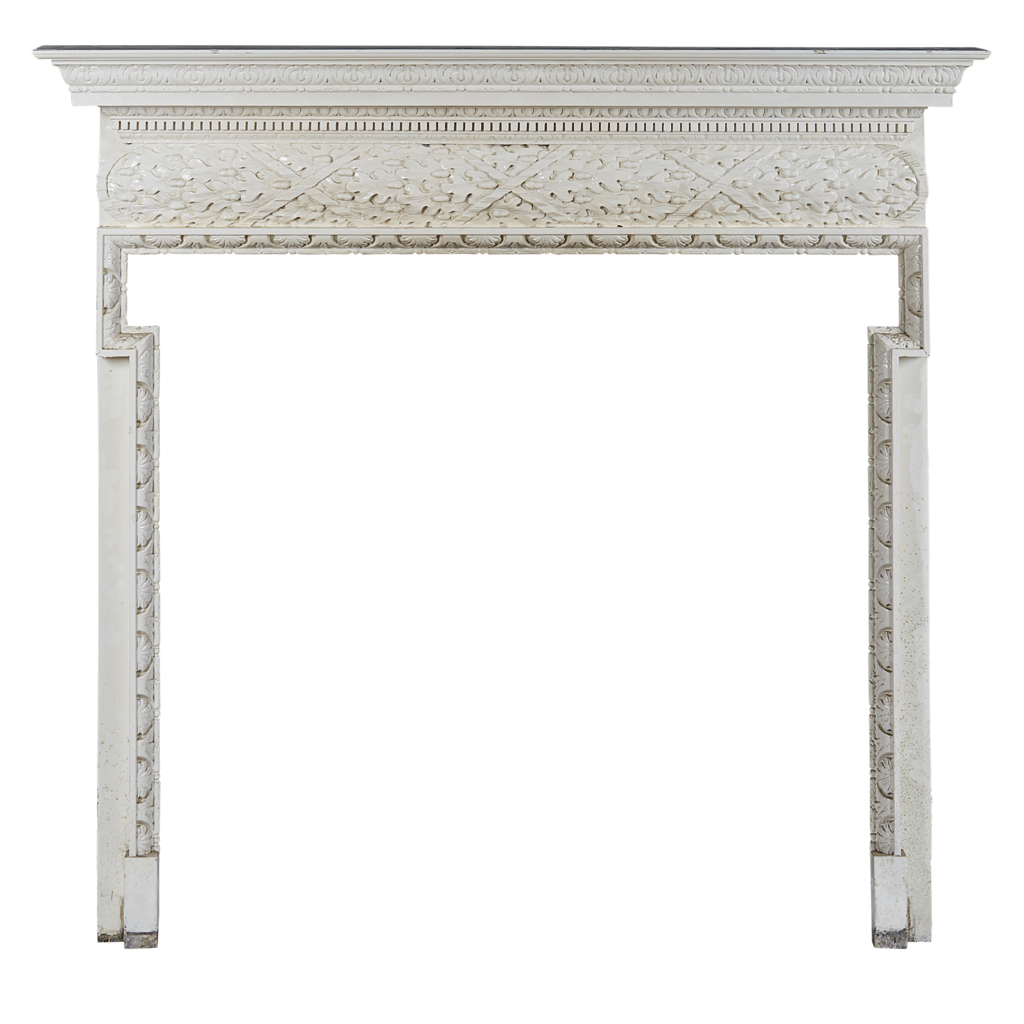 the leaf carved and moulded mantel above a deep convex frieze carved with oak leaves