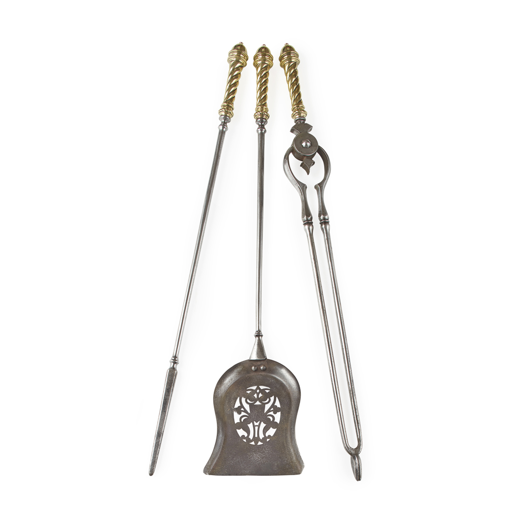 comprising a poker, 74.5cm long; a pierced shovel, 74cm long; and a pair of tongs, 74.5cm long, with brass sprial handles and domed terminals, (3)