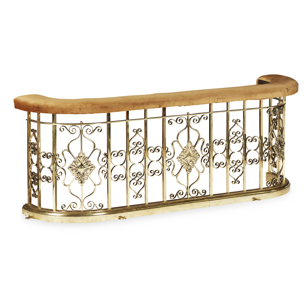 the D shaped padded cushion top in light brown plush, above openwork scrolling brass supports