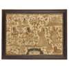 worked in silk and metallic threads on a silk ground, depicting a lady with a harp and a soldier flanked by male and female attendants, against a field filled with flowers, buildings, figures, a tree, a lion, a stag, a rose and a carnation, in an ebonised frame