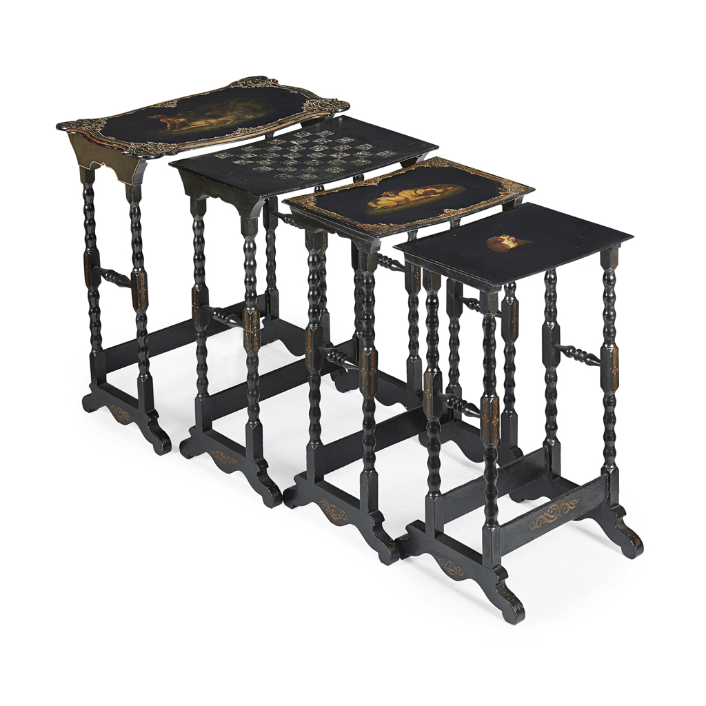 SET OF VICTORIAN EBONISED, PAINTED, AND ABALONE QUARTETTO TABLES