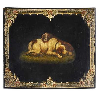 the largest table with a shaped top painted with dogs in a polychrome and gilt border; the next with an abalone inlaid games board; the remaining tables painted with further dogs, on bobbin turned legs and trestle supports (4)