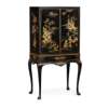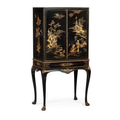 of cubic form decorated in the Chinese taste with figures in a garden and temples, opening to a red lacquer and shelved interior, raised on cabriole legs ending in pad feet