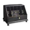 the open sloped front enclosing five pigeon holes above five short drawers with brass handles, all above a single long drawer, raised on ball feet
