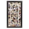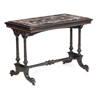 the rectangular top with marble geometric inlay set in an ebonised and gilt frame raised on twin fluted end supports and curved trestle legs with porcelain castors
