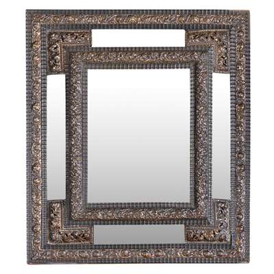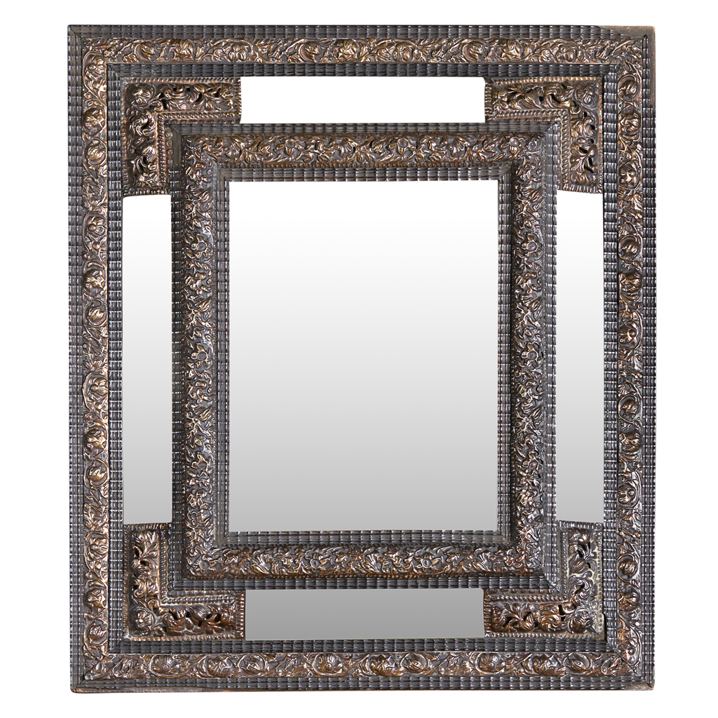 in the 17th century style, the bevelled mirror plate in a pierced floral repousse brass and ripple cut ebony frame with mirror margin plates