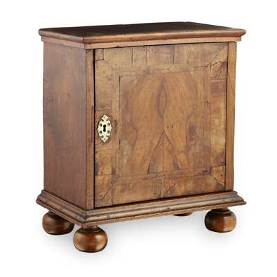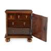 of rectangular form, with a single banded door opening to a series of six graduated drawers with drop handles, with indistinctly stamped hinges, all raised on bun feet