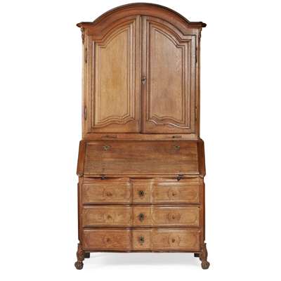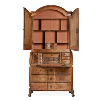 the arched cornice above a pair of moulded panel doors opening to a compartmented interior, the lower part with a slant front opening to an interior fitted with drawers and a recess, above three long serpentine drawers, raised on acanthus carved legs ending in claw and ball feet