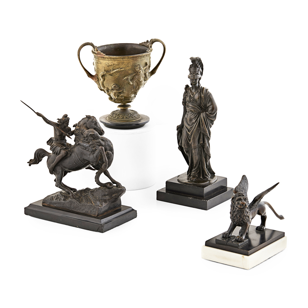 comprising AMAZON ON HORSEBACK ATTACHED BY TIGER by August Karl Edouard Kiss (1802-1865), with Zimmerman, Hanau, foundry stamps, on the slate base, 19cm high; a LION OF ST. MARK on a white marble base, 17.5cm long; a figure of MINERVA, on a stepped slate base, 25cm high; and the POMPEIIAN KANTHAROS, after the antique, 15.5cm wide (4)