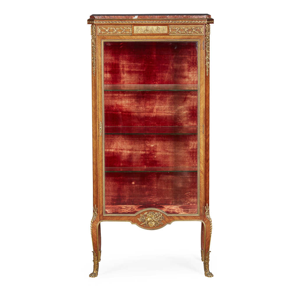 the rouge marble top over a frieze centred by a gilt bronze relief of putti, above a bevelled glass door opening to glass shelves and a red velvet lined interior, raised on square cabriole legs with paw sabots