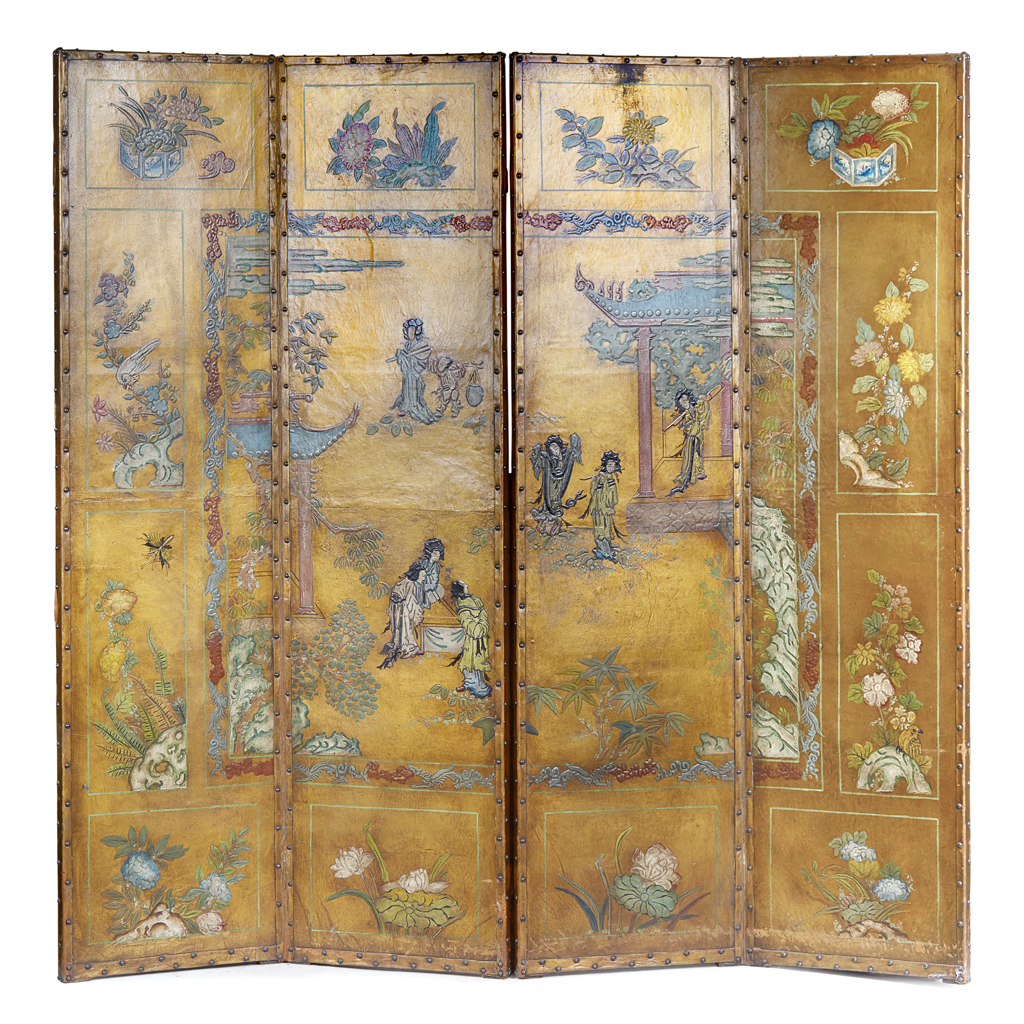 CONTINENTAL PAINTED LEATHER FOUR-FOLD SCREEN