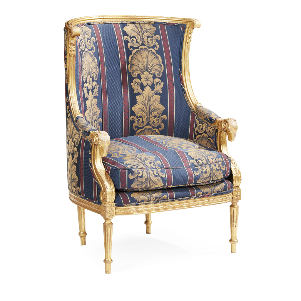 with a curved back and enclosed part-padded arms over a loose cushion seat, the moulded giltwood frame with ram’s head terminals and leaf carved scrolls, raised on fluted tapered legs, in dark blue acanthus and shell striped fabric