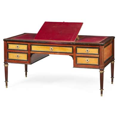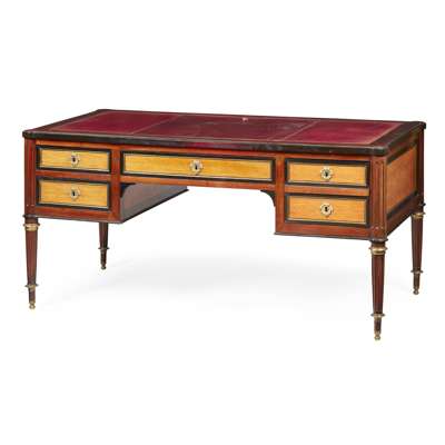 FRENCH EMPIRE STYLE MAHOGANY, SATINWOOD, EBONISED AND BRASS MOUNTED BUREAU PLAT
