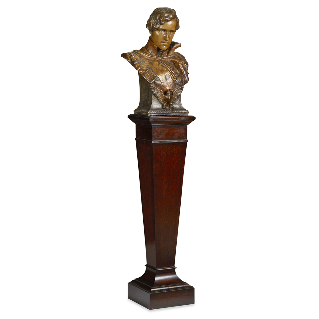 the polychrome and gilt bust with stamped marks; together with a MAHOGANY SQUARE TAPERED PEDESTAL (2)
