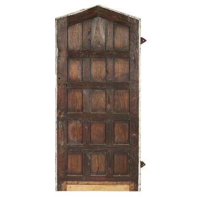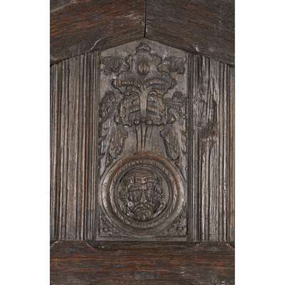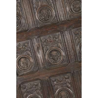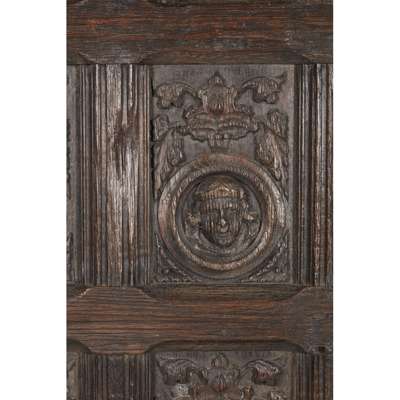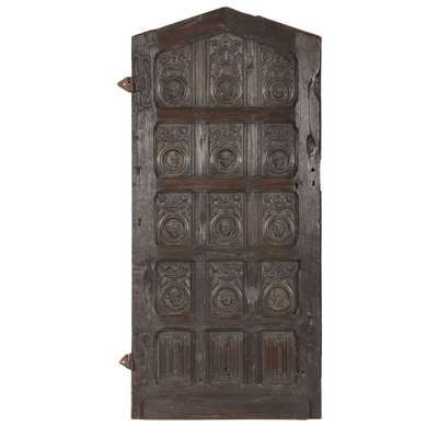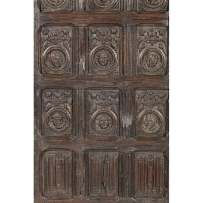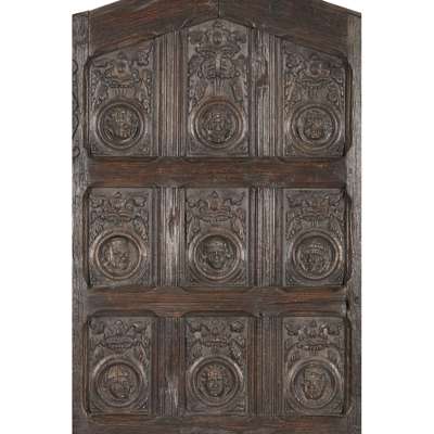 the arch frame with twelve relief carved panels centred by portrait roundels of putti and historic figures, over three further panels with linen fold carving, mounted with scrolled iron hinges